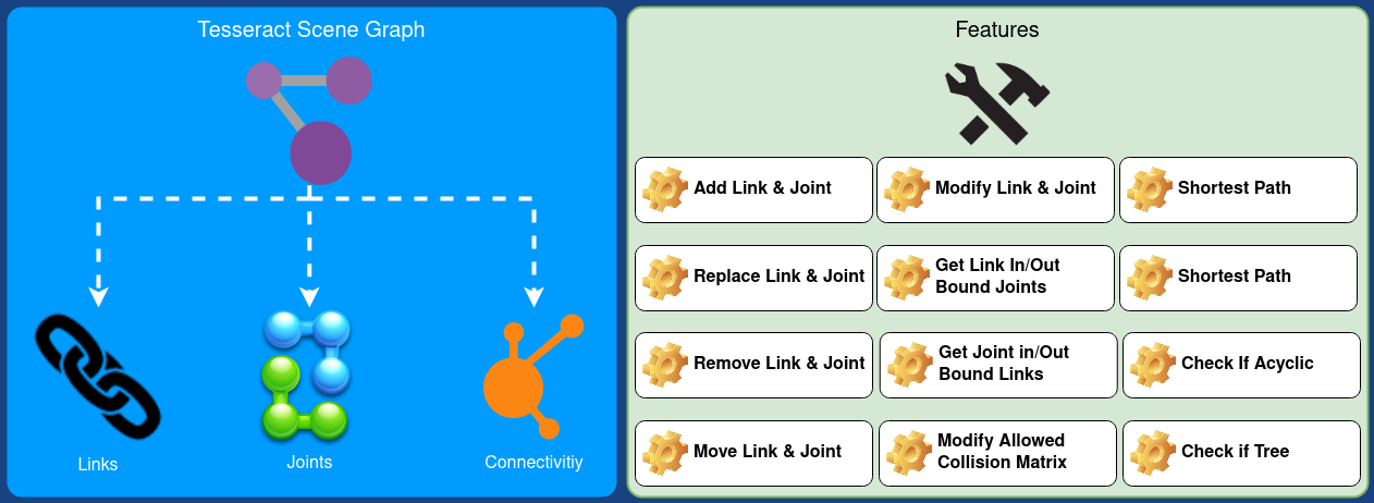 The scene graph is the core data structure in Tesseract that manages the connectivity of links and joints in your robot and workcell. It inherits from Boost Graph, giving you access to the full suite of Boost graph algorithms for traversal, search, and analysis.